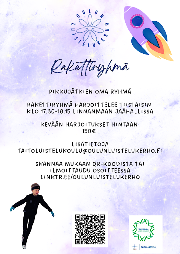 Rakettiryhmä on oma ryhmä 3-7 vuotiaille jätkille. Jäällä harjoitellaan perusluistelun lisäksi hyppyjen ja piruettin alkeita sekä erilaisia liukua. Harjoituksissa käytetään monipuolisesti välineitä, musiikkia ja leikkeä, jotka tekevät oppimisesta hauskaa ja innostavaa.
