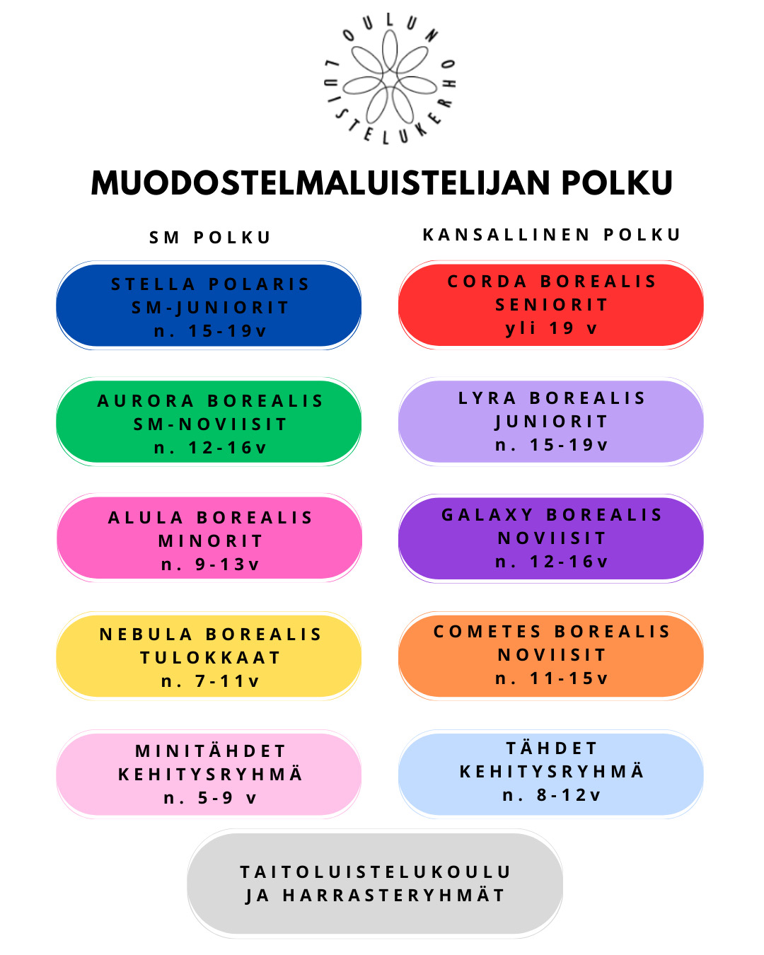 Muodostelmaluistelun perusteita ja luistelutaitoa harjoitellaan Minitähdet ja Tähdet kehitysryhmissä.